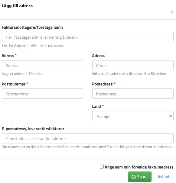 - Klicka "Lägg till adress" , fyll i fälten och ange mailadress i "E-postadress leverantörsfakturor". Bocka i "ange som förvald fakturaadress" och spara sedan.