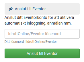 På sidan Mitt konto finns en knapp för att aktivera automatiskt inloggning till Eventor. Klicka på Anslut till Eventor. Ange ditt lösenord hos IdrottOnline eller Eventor och klicka på anslut.