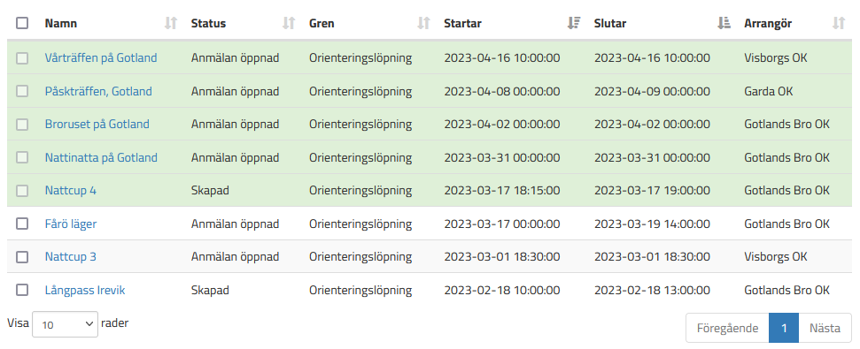 Markera de tävlingar ni vill lägga till och klicka på Importera högst upp på sidan. En grön bock indikerar lyckat resultat.