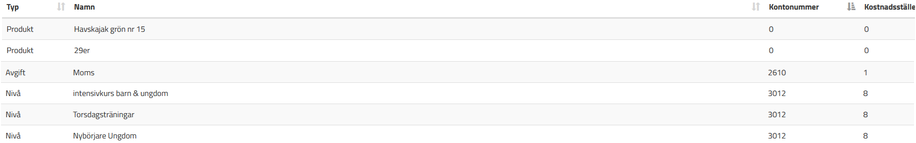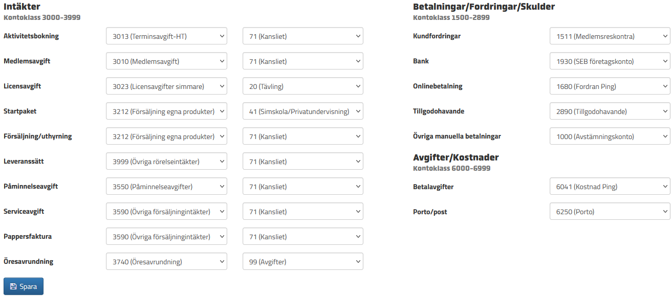 Detta är era grundinställningar, dvs om specifika inställningar saknas i de olika delarna för era intäkter (ex sektion/typ/nivå eller produkt) kommer dessa att tillämpas. Detta för att säkerställa att alla bokföringshändelser blir bokförda enligt era önskemål.