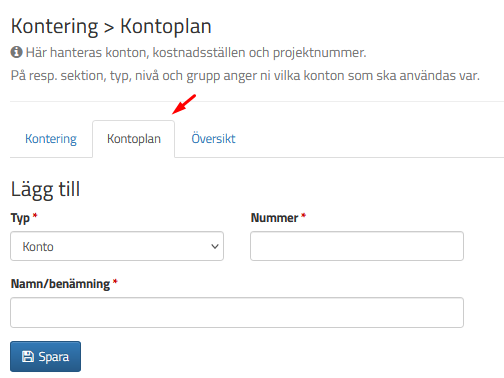 Ange Typ, konto/kostnadsställe/projektnummer och namn, klicka sedan på spara