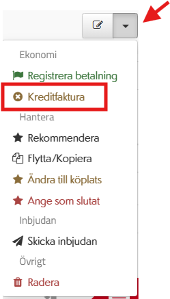 - Kreditera fakturan om det finns en utställd genom att gå in på gruppen, flik bokningar, och klicka på den pil som visas längst ut till höger på deltagarens rad.