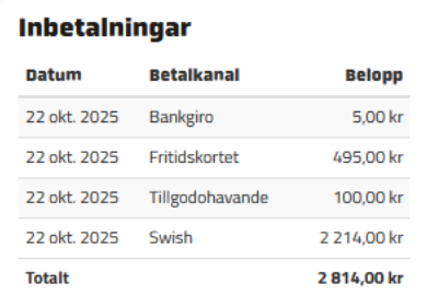 - Genom att klicka upp fakturans detaljer visas om betalning är gjort via Fritidskortet,