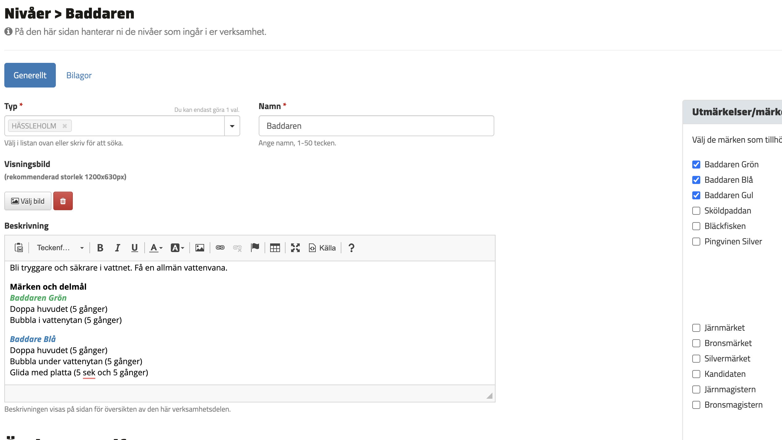 Under grupper kunde det sen ligga en ny flik som heter ex Märken, bra för oss inom simning, där de märken som är kopplade till nivån syns. Denna ligger efter Informationsfliken innan deltagare. Informationsfliken är ju till för specifik information till den gruppen. Men målen/märkena är ju för nivån.
