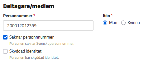 Kombinationen av födelsedatum och 4 sista måste vara unikt bland era personer/medlemmar och näst sista siffran måste matcha juridiskt kön. - Bocka i Saknar personnummer
